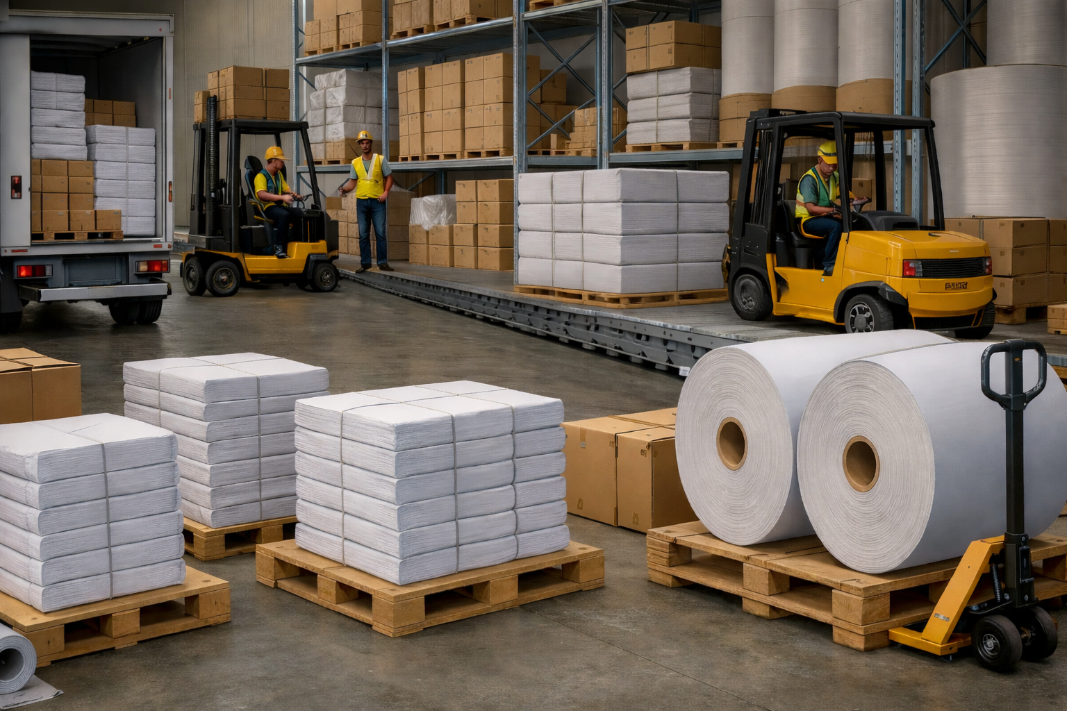Gudang kami selalu terisi penuh dengan berbagai jenis dan ukuran kertas siap kirim.